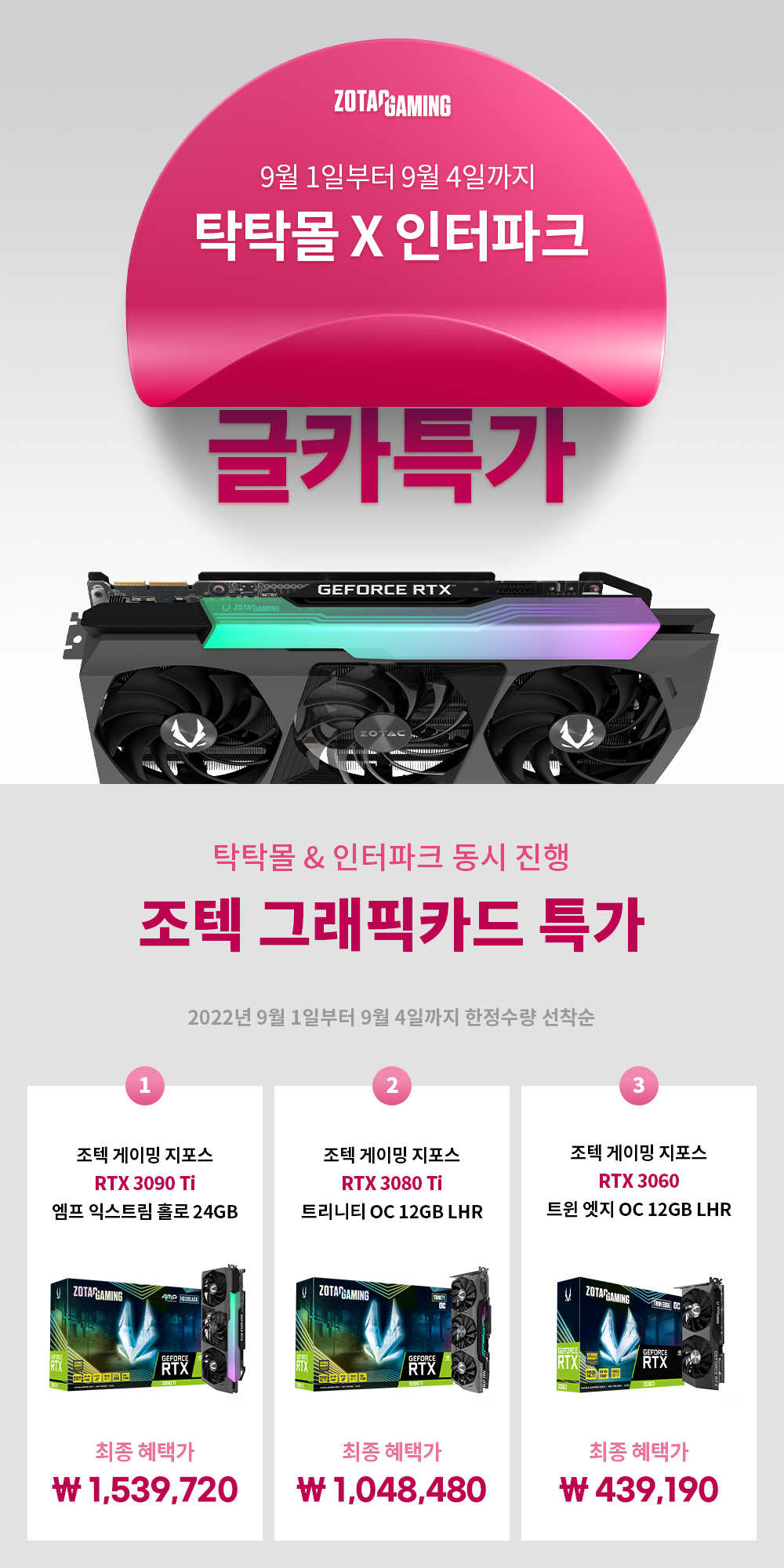 ÁöÆ÷½º ±×·¡ÇÈÄ«µå Àü¹® ±â¾÷ Á¶ÅØÄÚ¸®¾Æ(ZOTAC Korea, ´ëÇ¥ÀÌ»ç ±è¼ºÇ¥, www.zotackor.com)´Â °ø½Ä ÀÚ»ç¸ôÀÎ ‘ŹŹ¸ô(www.tagtag.co.kr)’°ú ¿ÀǸ¶ÄÏ ‘ÀÎÅÍÆÄÅ©(www.interpark.co.kr)’¿¡¼ Á¶ÅØÀÇ Àα⠰ÔÀÌ¹Ö ±×·¡ÇÈÄ«µå 3Á¾ Ư°¡¸¦ 9¿ù 1ÀϺÎÅÍ ÁøÇàÇÑ´Ù.